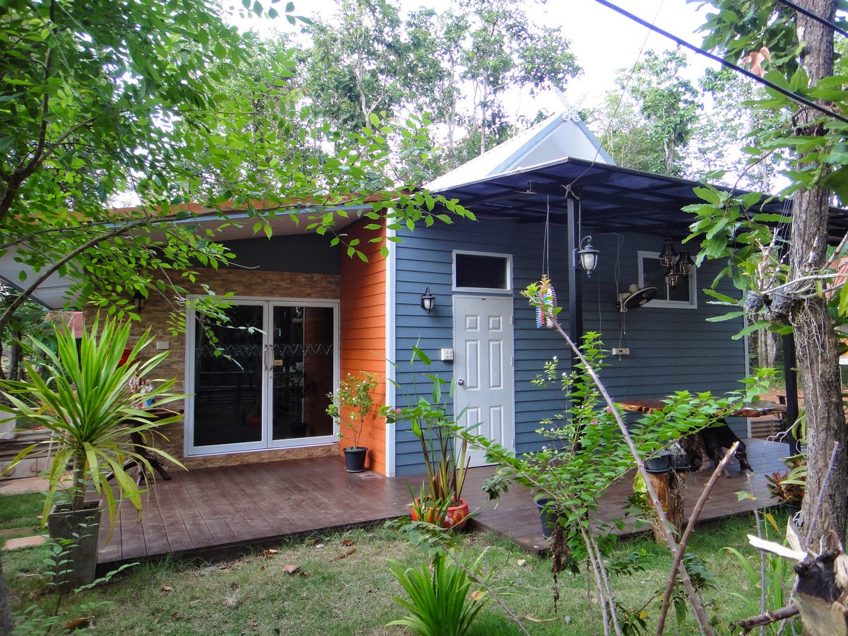 พื้นที่ด้านหน้าได้ออกแบบเป็นลานปูด้วยแผ่นพื้นเชอร่า และทำเพิงกันแดนฝนเพื่อเป็นพื้นที่นั่งเล่นหนือทำงาน ยังมีรอยสีเปรอะเปื้อนเป็นให้เห็นอยู่ แสดงว่าคุณพ่อได้ใช้เป็นที่เขียนงานศิลปะที่ชื่นชอบ อีกทั้งตกแต่งสวนหย่อมเป็นพื้นที่สีเขียวเข้ากับตัวบ้าน ทำให้ที่พักแห่งนี้ร่มรื่นสวยงามและโดดเด่น มิต่างอะไรกับรีสอร์ทหรูที่พบเห็นตามแหล่งท่องเที่ยวทั่วไป