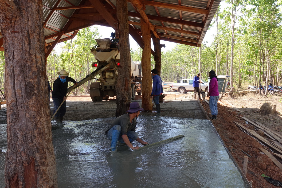 แม่บ้าน และเยาวชนที่ช่วยกันเทพื้นศาลาสันติสุข เมื่ออาทิตย์ 8 เมษายน 2018 จนเสร็จสมบูรณ์